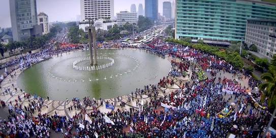 | Massa buruh berkumpul di Bundaran HI pada aksi 1 Mei 2017. |
